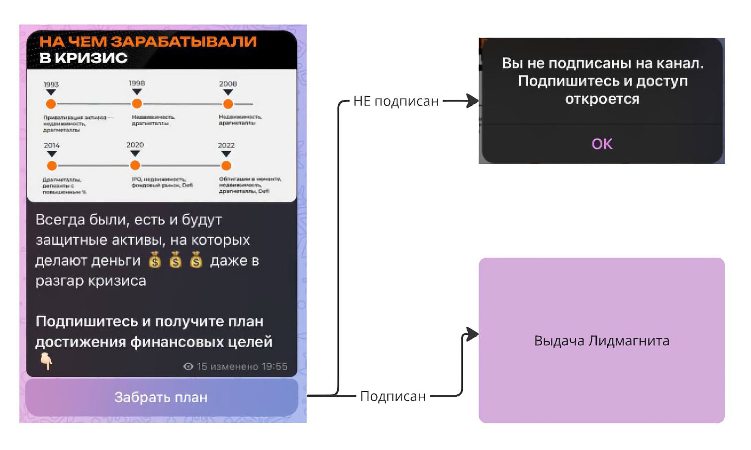 Человек заходит в твой канал, видит пост с умной кнопкой.
