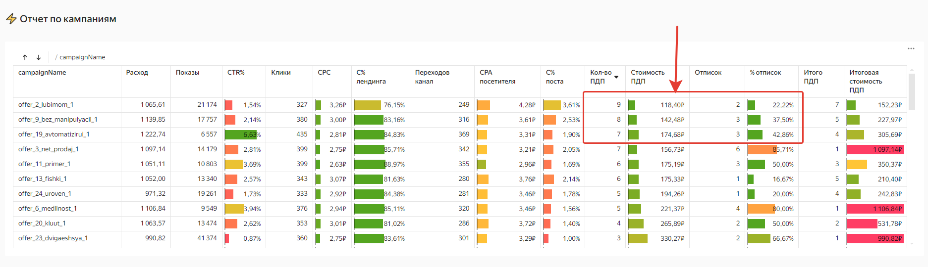 Оптимизация креативов: Анализ показателей позволил снизить стоимость подписчика почти вдвое за счет выявления наиболее успешных офферов и креативов.