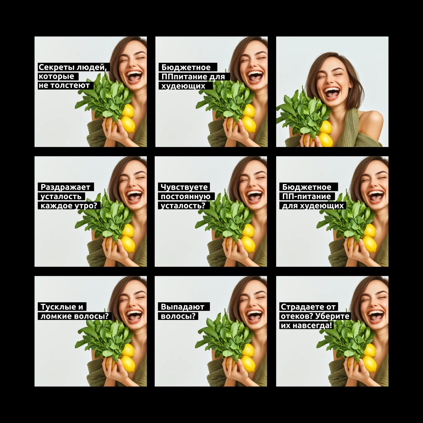 Соответствие болям аудитории: Каждое объявление адресует конкретную проблему (усталость, диеты без результатов, желание выглядеть моложе).