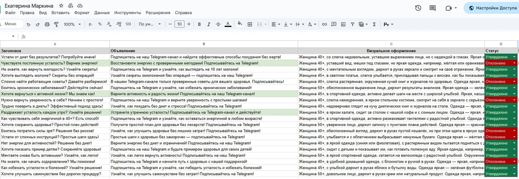 Мы создали набор объявлений, опираясь на ключевые проблемы и мотивы нашей аудитории: усталость, лишний вес, желание вернуть энергию и уверенность. Каждое объявление тщательно адаптировано к их болям и ожиданиям, чтобы вызвать эмоциональный отклик.