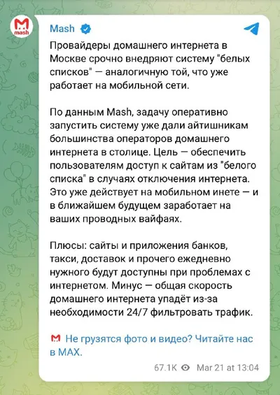 Белые списки начнут работать и на домашнем интернете Провайдеры Москвы срочно внедряют систему в свои сети и готовятся к массовым отключениям интернета, пытаясь сберечь для пользователей хотя бы базо