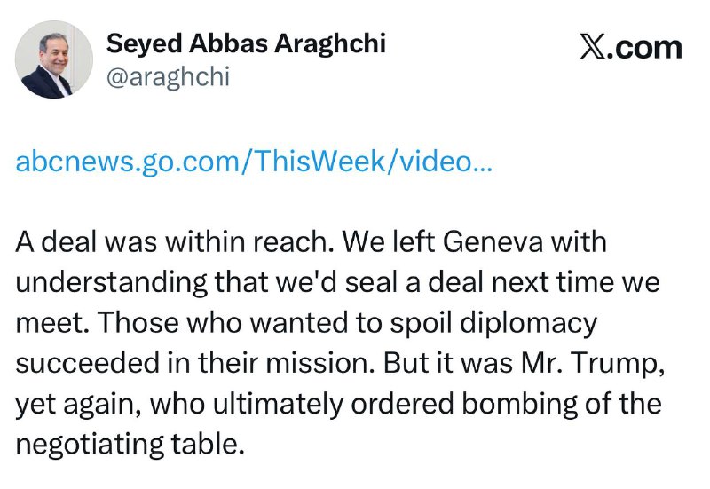 🇮🇷🇺🇸 Глава МИД Ирана: «Сделка была близка к завершению. Мы покинули Женеву с пониманием того, что заключим сделку при следующей встрече. Те, кто хотел сорвать дипломатию, добились своего. Но именн