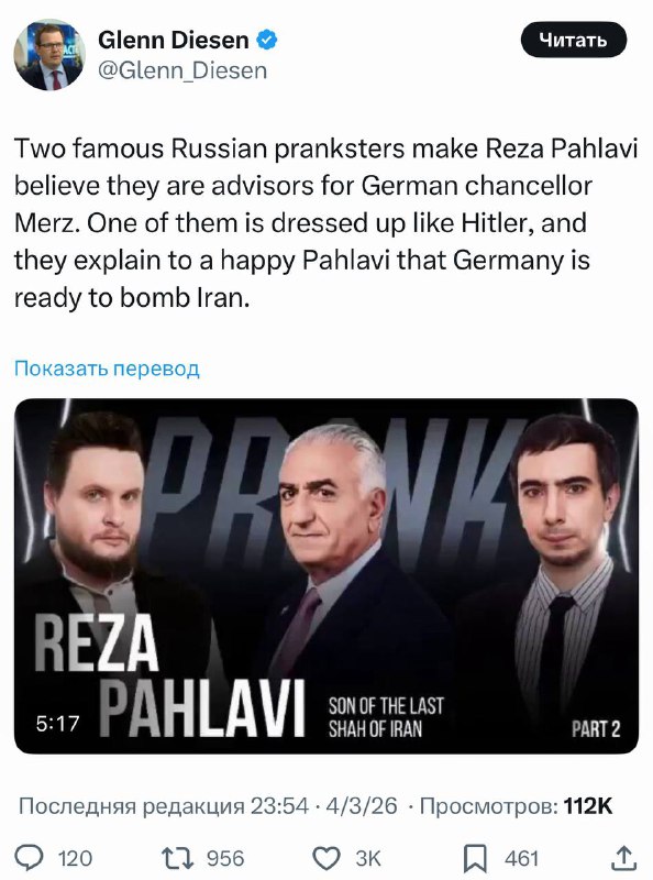 ❗️ Пранк с идиотом Пехлеви, как и ожидалось, вышел на международный уровень. Об этом говорит весь мир. Пранкеры Лексус и Вован растоптали и уничтожили этого мерзавца.