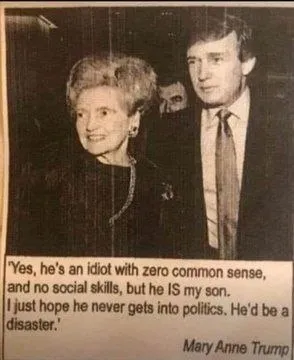 «Да, он идиот, которому чужд здравый смысл, и социопат, но он мой сын! Надеюсь лишь, что его никогда не занесет в политику, потому что это будет катастрофа». Мэри Энн Трамп 🇷🇺 Мы в МАХ 🇷🇺 Мы в Te