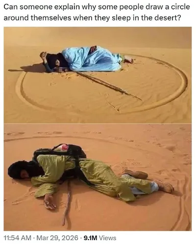 Кто-нибудь может объяснить, почему некоторые люди чертят вокруг себя круг, когда им приходится ночевать в пустыне? Так делают бедуины в Сахаре. Считается, что взрыхленный песок создает непреодолимый
