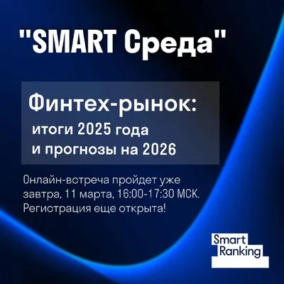 SMART Среда | Финтех в России: итоги 2025 года и прогнозы на 2026 📅 11 марта | 16:00–17:30 (МСК) Рынок финансовых технологий вырос на 15% за 2025 год. Но внутри совсем разная динамика: одни сегмент