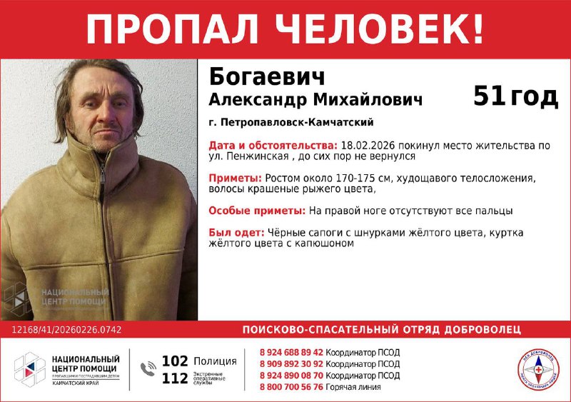 ‼️ Пропал 51-летний мужчина без пальцев на ноге В Петропавловске-Камчатском ведутся поиски 51-летнего Александра Михайловича Богаевича. Местонахождение мужчины неизвестно с 18 февраля 2026 года. В у