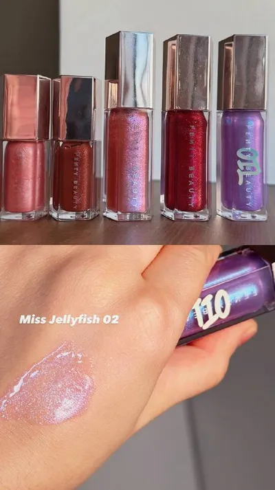 Моя коллекция Fenty блесков🤩 Как же я их обожаю. Реально необычные оттенки, приятный аромат и бомбовые текстуры. 2 оттенка из коллекции даже дуохромные (miss jellyfish и grape splash)🤩 А оттенок F