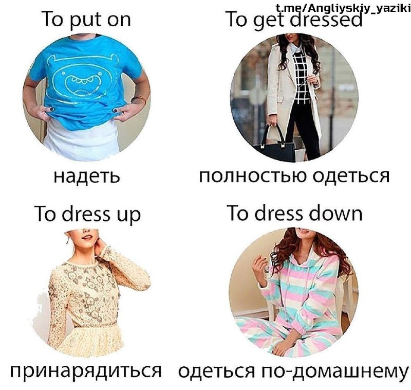 4 фразовых глагола, связанных с одеждой Изучите примеры ниже 👇 Это поможет лучше запомнить материал ♦️ To put on clothes/ shoes/ make-up/ cream - надевать одежду/ обувь/ наносить макияж/ крем to pu