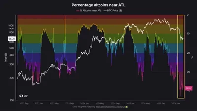 Капитуляция на рынке альткоинов Около 38% альткоинов находятся вблизи своих ATL — это самый сильный обвал за цикл. Даже во время краха FTX доля составляла 37,8%, что ниже текущего значения. Антон н