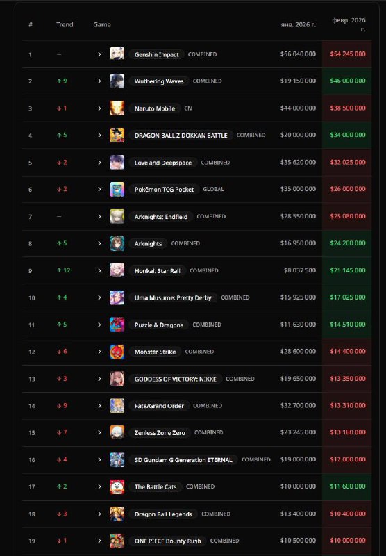 ❤️ Доходы за февраль с SensorTower Информация может быть не точной! 🔜 Arknights: Endfield занял 7-е место с доходом 25 млн$ ArknightsRC / #разное