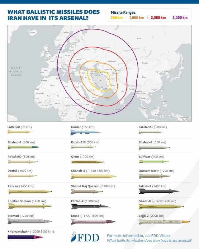 Инфографика показывает возможности Ирана по ответным действиям с помощью баллистических ракет. Кстати, если как утверждает Трамп, Ирану перед нападением оставалось 2 недели до ядерного оружия, а войн