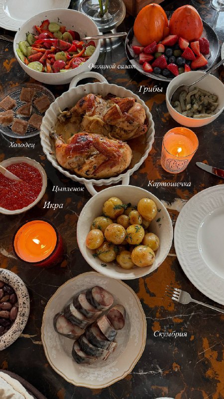 Семейный обед сегодня такой 🫰🏼 На столе: цыпленок с корочкой, картошечка, овощной салат, икра, грибы, холодец, скумбрия, капуста, оливки, ягоды 🌱