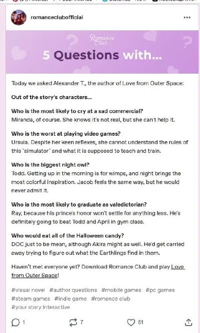 В официальном тамблере Клуба Романтики есть рубрика "5 вопросов с...", в которой снова поучаствовал Александр Тепиш, сценарист наших любимых историй 🤩 Мы перевели текст и теперь показываем вам ✨. "М