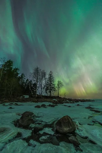 🌃 Остатки льда на берегу Финского залива, подсвеченные полярным сиянием 🗓 ночь на 21 марта 2026 📍 ЮБЗ, ЛО 📷 vk/tg @andrey_snimaet