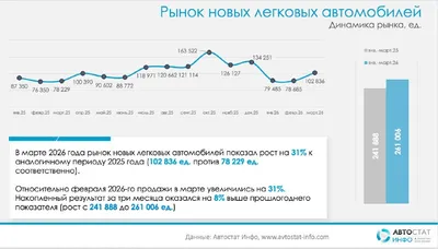 В марте 2026 года рынок новых легковушек в России превысил 102 тыс. машин По данным «Автостат Инфо», в марте 2026 года рынок новых легковых автомобилей в России заметно оживился после слабого старта