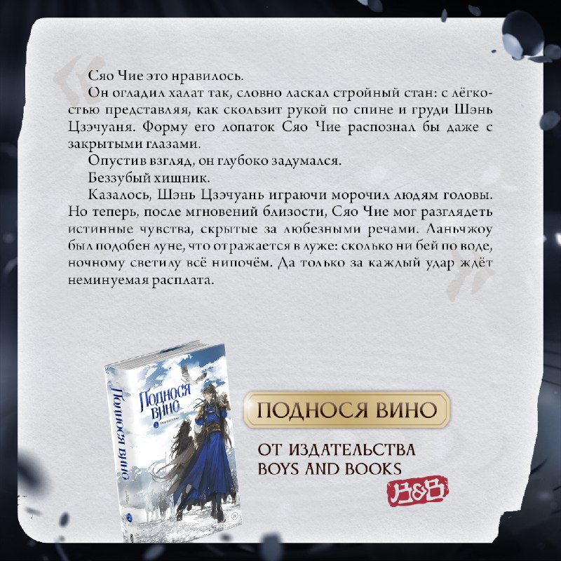 🤩 Цитаты из «Поднося вино. Том 2» За что читатели высоко ценят роман Тан Цзюцин, так это за накал страстей между героями. И второй том не отстаёт от первого — между Сяо Чие и Шэнь Цзэчуанем искрит д