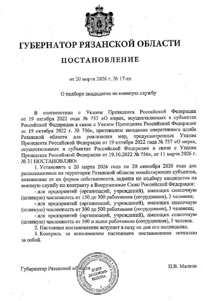 В Рязанской области предприятиям приказано предоставить от 2 до 5 человек для участия в СВО Губернатор Павел Малков обязал местные предприятия активно искать кандидатов на контрактную службу. Согласн