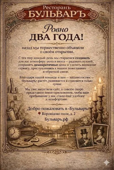 Ресторан «БульварЪ» ровно два года назад торжественно объявил о своём открытии. С тех пор каждый день мы стараемся создавать для вас атмосферу уюта и вкуса — радовать кухней, сохранять демократичные