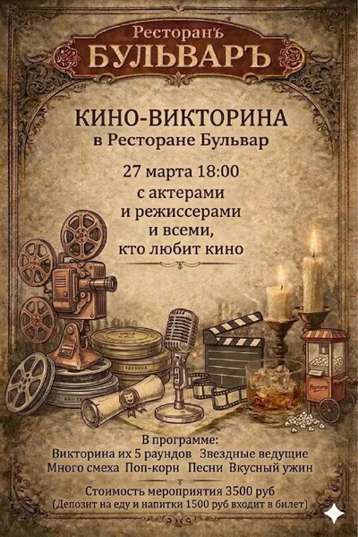 27 марта Международный день театра. Встречаем в БульварЪ на Кино-Викторине с актёрами и любимыми гостями БульварЪ В программе: Ужин ( депозит 1500 руб) Командная викторина с призами и подарками от
