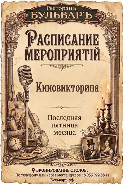 Последняя пятница месяца уже завтра!! И через несколько дней апрель🤩 А это значит, что БульварЪ ждет вас на киновикторину По промокду #кино вход по депозиту 1500 руб, который вы можете потратить н