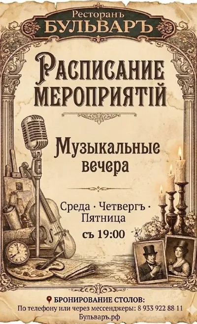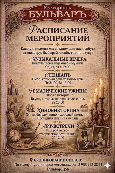 🍴Каждую неделю тематические мероприятия в БульварЪ, 🍽где вы наслаждаетесь блюдами основного и специального дегустационного снзонного меню, раскрывающее историю, концепцию или культуру старинных р