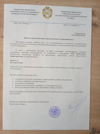 Внимание! Очередная провокация! В организации приходят провокационные письма якобы от Департамента финансового мониторинга Комитета государственного контроля Республики Беларусь с требованием предост