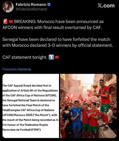 ЧТООООООООООООО? Марокко признали победителем Кубка Африки спустя 2 месяца… Победу Сенегала отменили, вписав ему технарь 0:3 из-за протеста на последних минутах. @CaptainFint 🟢