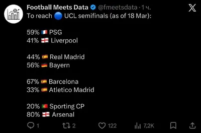 Шансы на выход в полуфинал ЛЧ от Football Meets Data и Opta. И те, и другие считают, что нас ждут полуфиналы: 🇫🇷 – 🇩🇪 🇪🇸 – 🏴 Ждем или нет? @CaptainFint 🟢