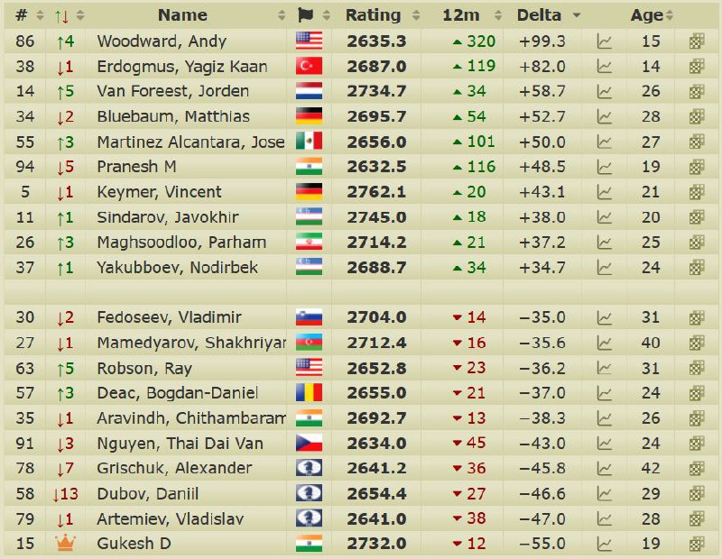 📈📉 ТОП-10 шахматистов, набравших и потерявших рейтинг за последние 12 месяцев