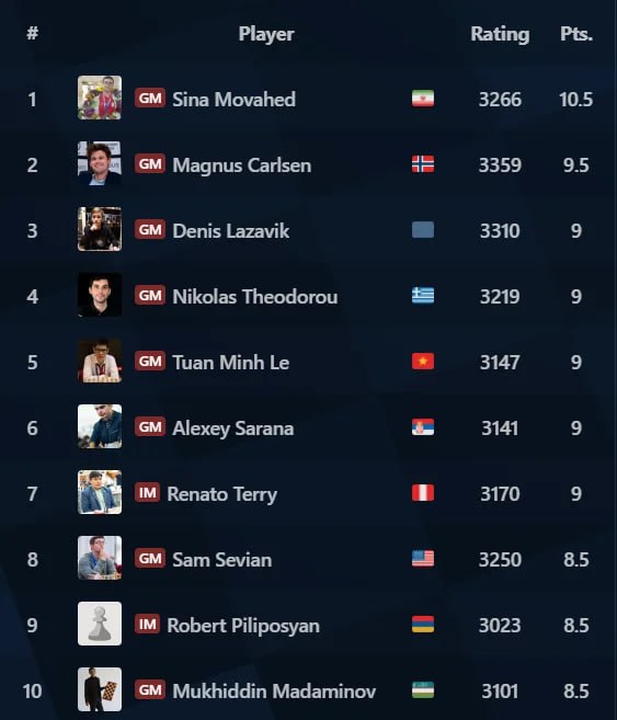 😲 Сина Мохавед разрывает титульный вторник с результатом 10.5/11, обыгрывая по ходу Магнуса Карлсена