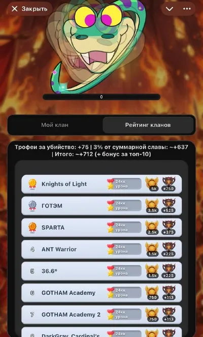 ☕️ Доброе утро! 😈 "КЛАНОВЫЙ БОСС" повержен !!! Поздравляю ГОТЭМ с первой победой. Все три клана в топ 7 рейтинга это победа. И это еще составы не сформированы. Так что Свету не стадо амбасадоров н