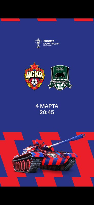 На плакате изображён танк — это символ нового партнёрства ПФК ЦСКА с культовой онлайн-игрой «Мир танков»❤️💙 С 4 марта в игре появится танк Т-55 «Рысак» в клубных цветах, а впереди — совместные активн