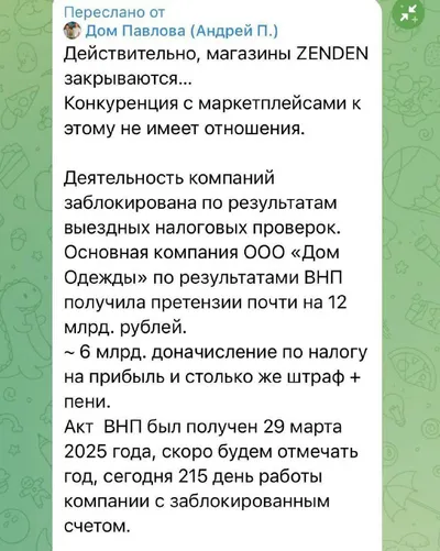 ⚡️ZENDEN закрывает магазины. Нет, причина не в конкуренции с маркетплейсами. Основатель сети сообщил, что деятельность компаний фактически заблокирована после выездных налоговых проверок. Ключевой юр