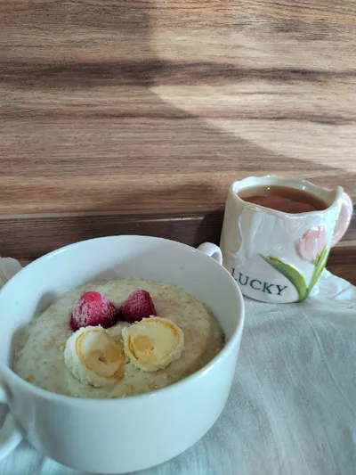 Отличного воскресенья, наполненного приятными сюрпризами и достижениями! На завтрак: овсяная каша на молоке с клубникой и Рафаэлкой. 😋 Пусть каждый миг приносит радость 😊!!! #завтраки
