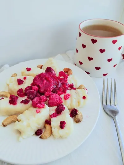 ✨✨✨✨✨✨🌸✨✨✨✨ Хорошего старта недели! Пусть она начнётся с ясной цели и лёгкого темпа, а каждый шаг приближает к желаемому💜💜💜 На завтрак: ленивые вареники с кешью и малиной 🤤 #завтраки
