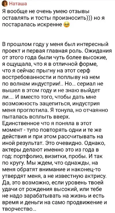 ⚡️ Сегодня делимся честным отзывом студентки курса "Главная роль. Архетипы" Наташи Иглиной Многие актёры узнают себя в этой истории: когда вы в хорошей форме, много работаете, ходите на пробы… но ин