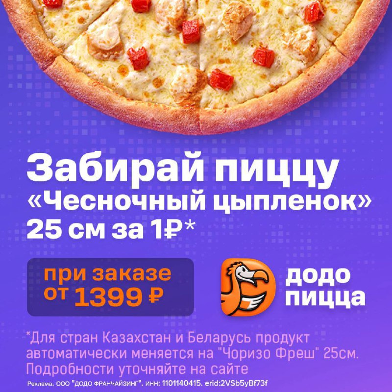 Пицца «Чесночный цыпленок 25 см» за 1₽ *! При заказе в «Додо Пицца» на сумму от 1399 рублей, Вы получаете возможность забрать пиццу «Чесночный цыпленок 25 см» всего за 1 рубль. В ассортименте не толь