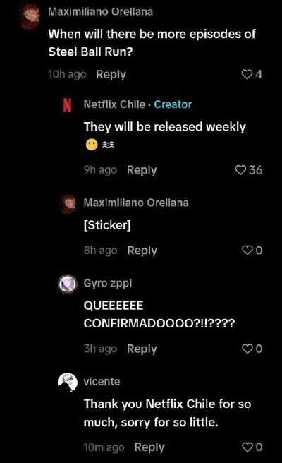 Не подтверждено, но по словам официального аккаунта Netflix Chile в TikTok - эпизоды «Steel Ball Run» будут выходить раз в неделю! UPD: Комментарий в итоге удалили🤫 Больше информации должны раскрыть