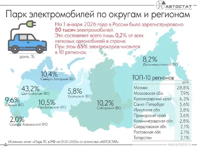 На 1 января 2026 года в России зарегистрировано 80 000 электромобилей, это всего 0,2% от общего парка легковых машин. Больше всего электрокаров сосредоточено в Центральном федеральном округе, на него
