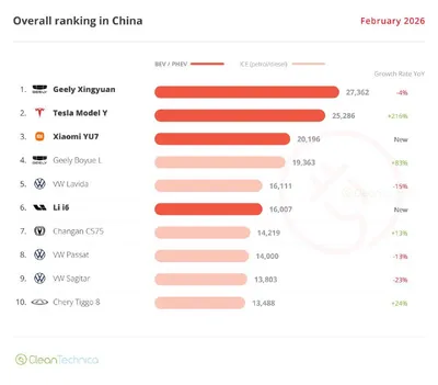 Продажи электромобилей в Китае в феврале 2026 года упали на 32%. Полностью электрические модели сократились на 35%, до 278 000, подключаемые гибриды — на 31%. Доля электромобилей составила 45% рынка п