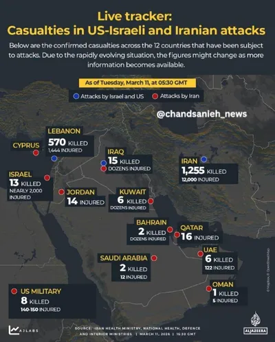 Потери в результате атак США, Израиля и Ирана (по состоянию на 11 марта 2026 года): 🇮🇷 Иран: 1255 погибших, 12000 раненых 🇱🇧 Ливан: 570 погибших, 1444 раненых 🇮🇱 Израиль: 13 погибших, около 200