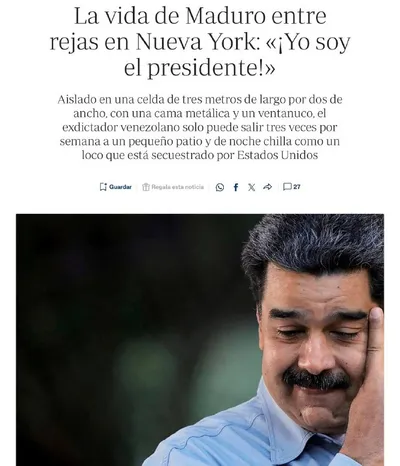 Мадуро кричит в тюрьме Нью-Йорка «Я президент!», — ABC. По данным издания, он содержится в федеральной тюрьме в Нью-Йорке в одиночной камере примерно 3×2 метра с металлической кроватью и маленьким ок