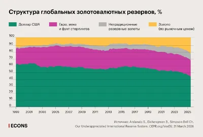 Структура международных резервов меняется: доллар уступает позиции, но не конкурентам, а золоту и нетрадиционным резервным валютам. 🔘 Доля доллара в резервах сокращается (до 57% в конце 2025 г.); но
