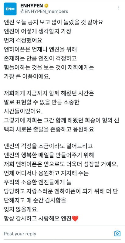 📎💬#twitter (ENHYPEN_members) — Мы думаем, что Энджин, должно быть, были очень удивлены, увидев сегодняшнее объявление. Первое, о чем мы беспокоились, это то, как Энджин будут себя чувствовать. Поск