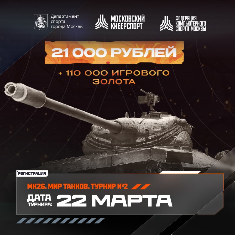 🏆 Серия турниров от Федерации компьютерного спорта Москвы продолжается! Стартует «МК26. Мир танков. Турнир №2» — на кону 21 000 рублей и 110 000 игрового золота. 🗓 Дата проведения: 22 марта, 18:00