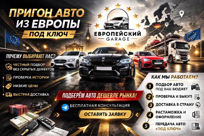 Бесплатная консультация по подбору авто из Европы 🚗 Мы — ЕВРОПЕЙСКИЙ ГАРАЖ🇪🇺 Занимаемся подбором и привозом автомобилей под ключ — от первого запроса до передачи ключей клиенту. Работаем с клиент