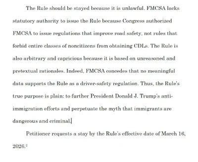 Вырезка из материалов дела иска Seattle WA к Department of Transportation, там 120 страниц. Действие данного Правила должно быть приостановлено, поскольку оно является незаконным. У FMCSA отсутствую