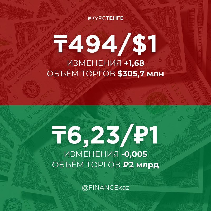 💸 Закончили день и неделю почти там же — 494 тенге за один доллар и 6,23 тенге за один российский рубль. #КурсТенге @FINANCEkaz