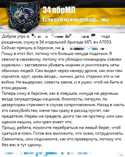 К нам бот обратился военнослужащий 34-й отдельной бригады морской пехоты ВСУ. Он ушел в СОЧ, потому что не смог терпеть преступные приказы командиров — убивать мирных жителей и бить по гражданской и